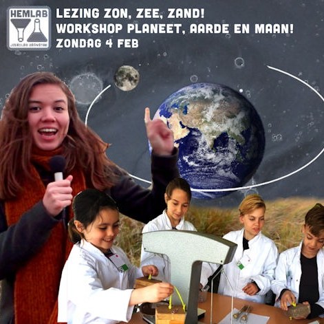 Op zondag 4 februari wordt er door het Hemlab (Zaandam) een middag georganiseerd waarop kinderen tussen 7 – 14 jaar gaan experimenteren en proefjes kunnen doen met het thema Aarde & Maan. Yvonne leidt deze middag in middels een Interactieve lezing over o.a. Eb & Vloed en meer leuke weetjes over de Zon, Zee & Zand!